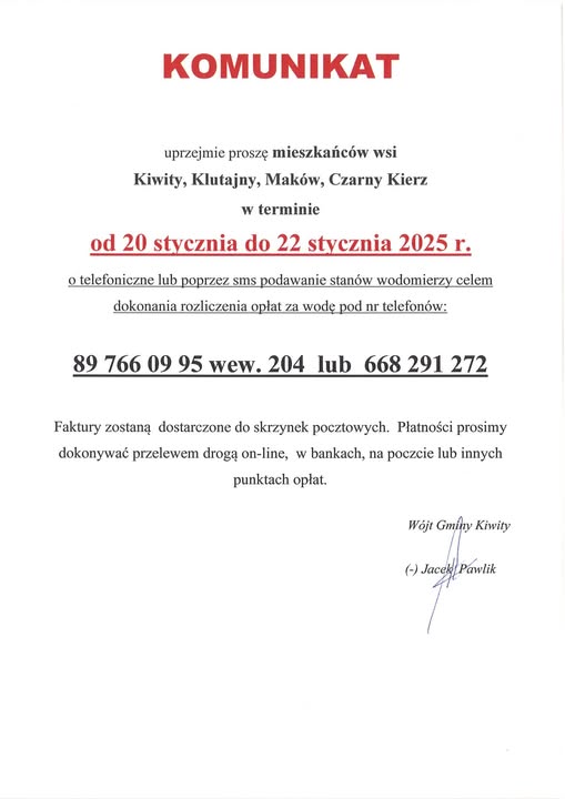 Prośba o przesyłanie stanów wodomierzy smsem bądź podawanie telefonicznie. 16-01-2025Data publikacji, 16-01-2025, Administrator Gmina KiwityAutor, Administrator Gmina Kiwity, 80Ilość wyświetleń, 80 Archiwum